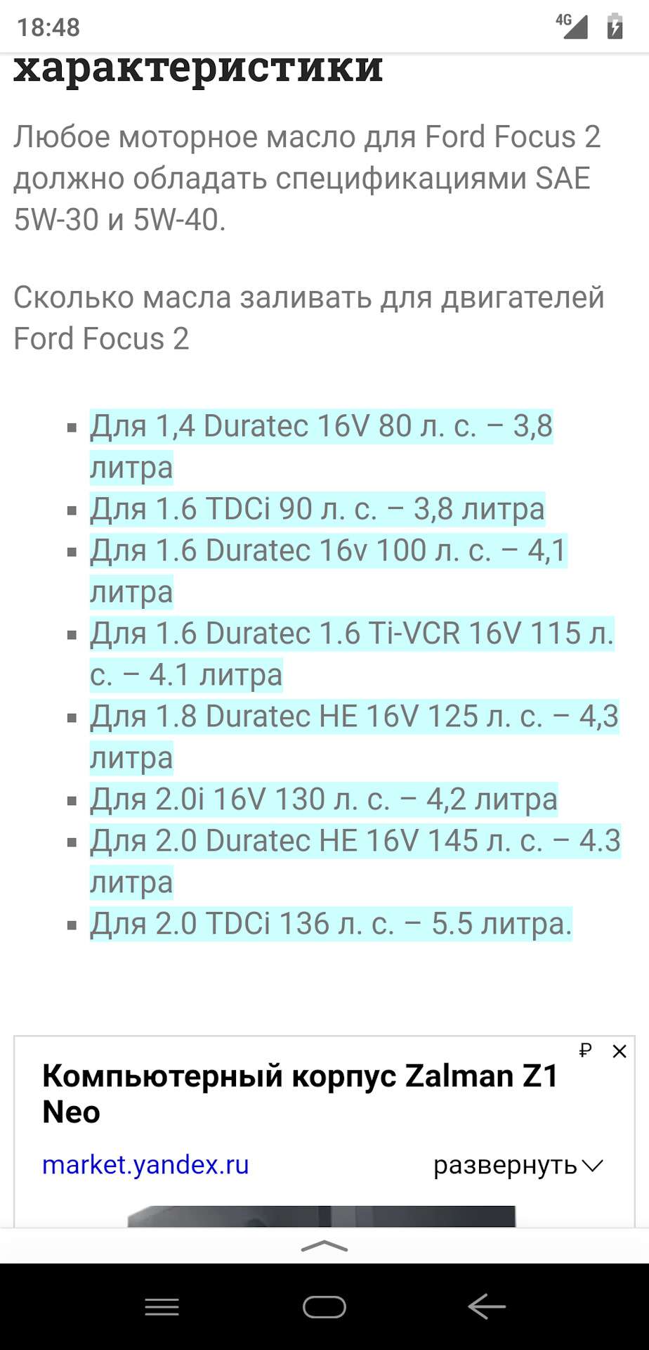 Рекомендуемые объемы масла для различных двигателей Ford Focus