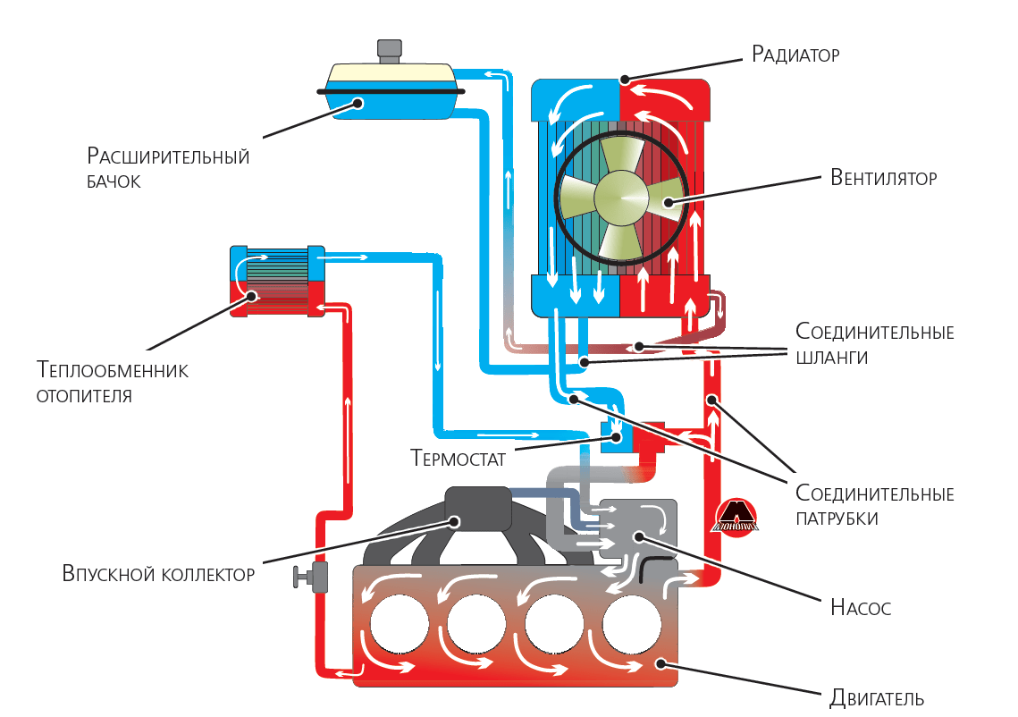 - Нагретая охлаждающая жидкость поступает к термостату;