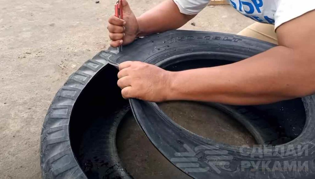 Самый простой способ разрезать болгаркой. Идет как по маслу и не требуется никакого усилия. Я так разрезал уже с десяток покрышек. Другой вариант, если вы хотите заняться художественной резкой. В таком случае вам понадобится дополнительно хороший острый нож, чтобы резать кривой линией. Но покрышка жесткая и одному придется постараться. Если вы режете ножом, то уже резаную часть вам нужно распирать. В противном случае нож будет зажимать. Так сантиметр за сантиметром разрезая и распирая у вас все получится.