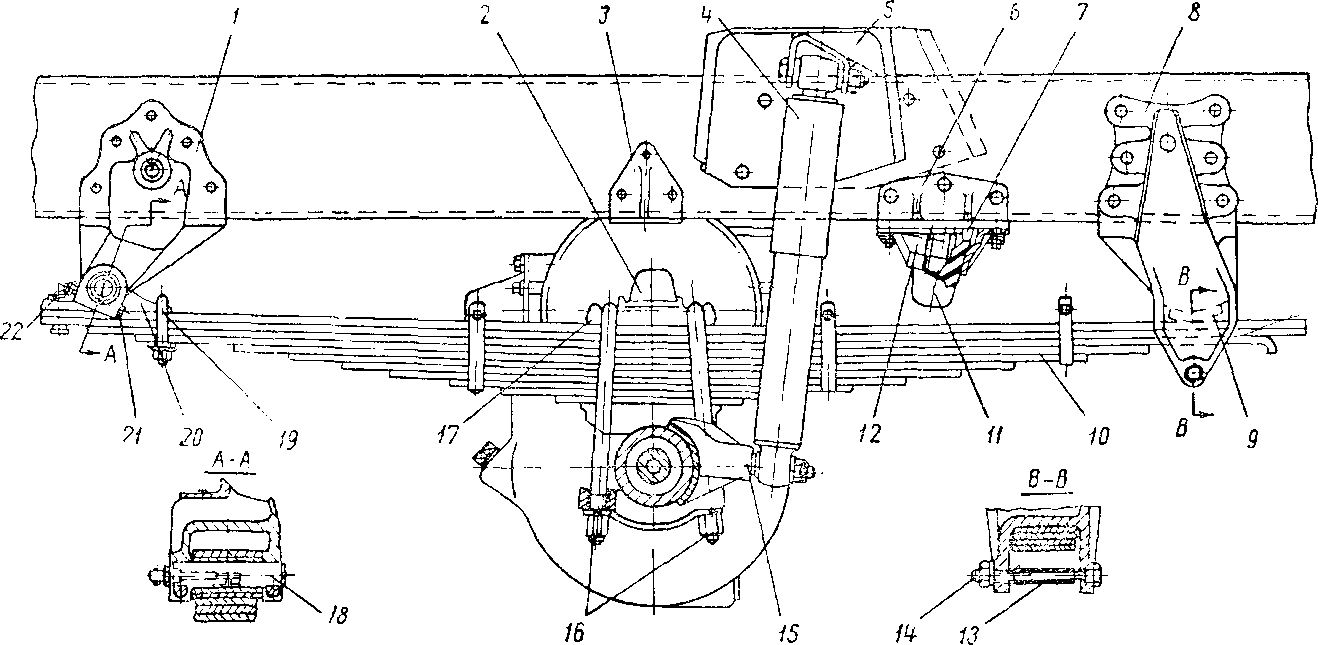 Спереди они соединяются с рамой специальными креплениями, а сзади являются скользящими. Задняя подвеска сделана по балансирному типу, имеет две полуэллиптических рессоры, которые крепятся к скользящим опорам.