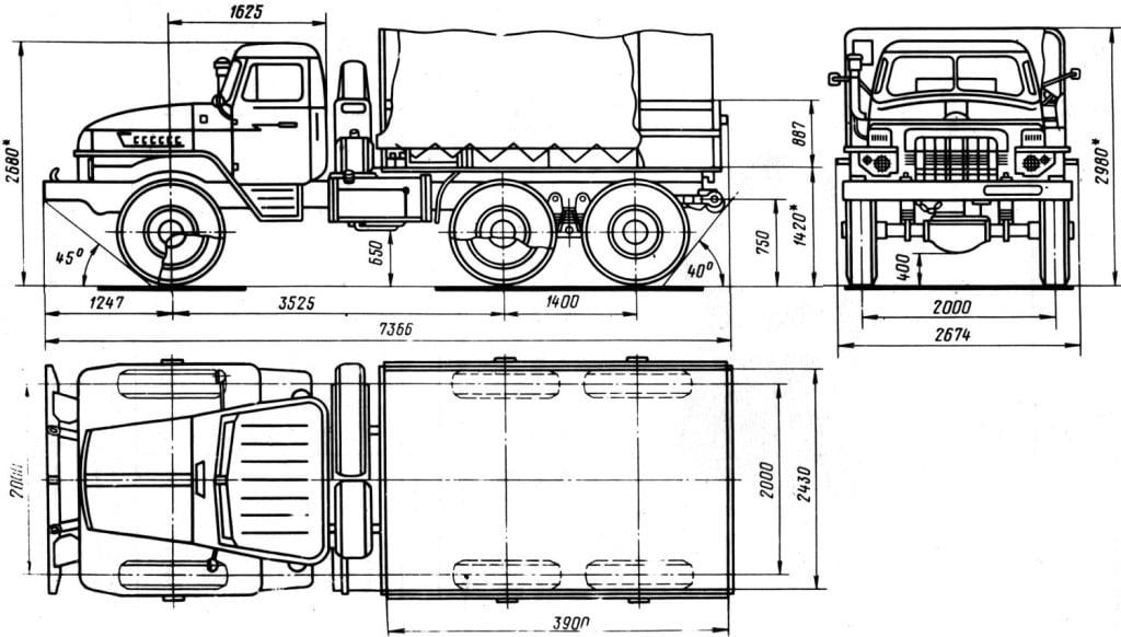 - Длина: 7,350 м; Ширина: 2,690 м; Высота, без груза: 2,680 м (по кабине), 2980 м (по тенту).